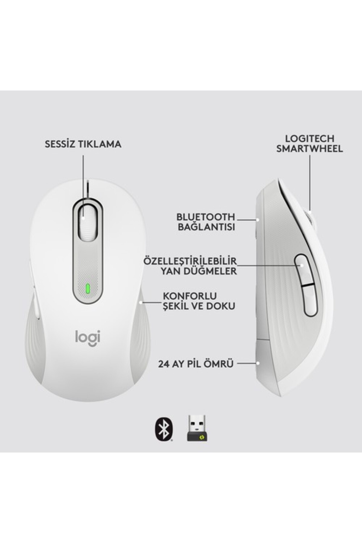 Signature M650 ile daha akıllı kaydırma deneyimine, daha iyi konfora ve daha fazla verimliliğe Çok yönlü mouse, satır satır hassas kaydırma ve tek bir vuruşla süper hızlı serbest dönüş moduna otomatik geçiş sağlayan SmartWheel uyarlanabilir kaydırma tekerleğine sahiptir. Daha küçük, daha büyük ve sol elle kullanıma yönelik seçenekler, herkes ile mükemmel uyum sağlayacağı anlamına gelir. Sorunsuz kablosuz bağlantı, özelleştirilebilir yan tuşlar ve konforlu şekil saatler boyunca konforlu ve verimli olmanızı sağlar. Logitech?in SilentTouch teknolojisi odağınızı bozmamak için sessiz tıklama özelliği sunarken 24 ay pil ömrü ve evrensel işletim sistemi uyumluluğu sorunsuz performans sağlar. Logitech Signature M650 Küçük ve Orta Boy Sağ El için Sessiz Kablosuz Mouse - Beyaz